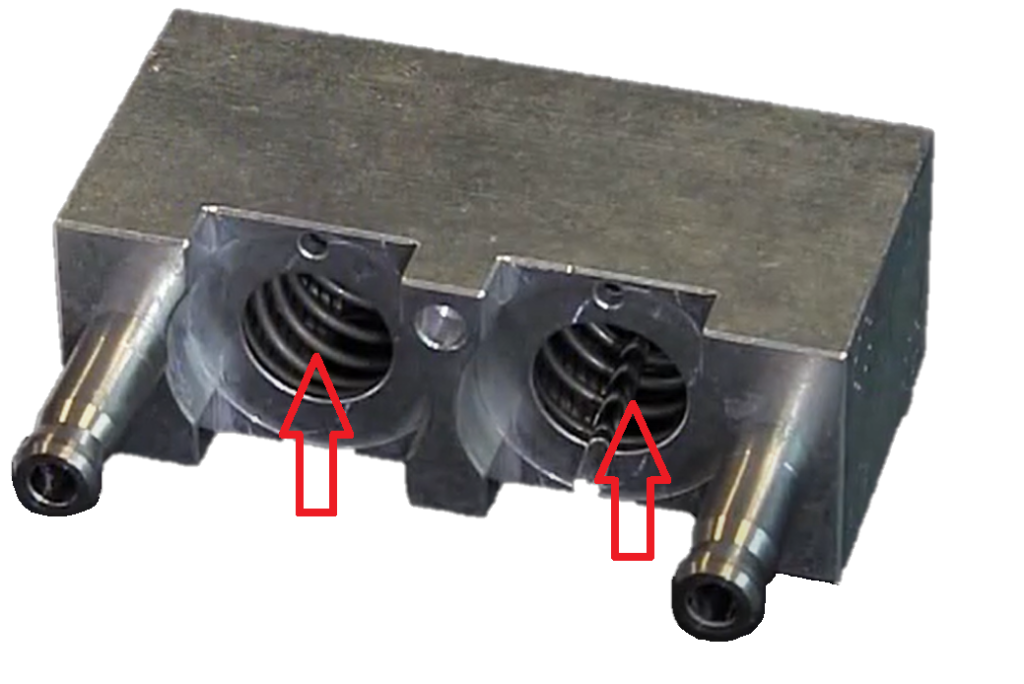شکل 2. محفظه پیستون مجموعه سر پمپ: فلش های قرمز فنرها را نشان می دهد که پیستون ها را به عقب می راند. در قسمت سمت راست تصویر پیستون شیشه ای نمایان است.